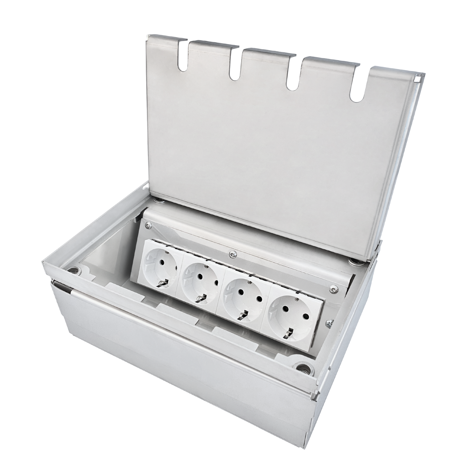 Robust und sicher: Die Steckdosenbox ist für Einzellasten bis zu 350 kg ausgelegt und nach DIN VDE 0634 Teil 1 begehbar. Die im Lieferumfang enthaltenen 4 Schutzkontaktsteckdosen von Legrand (VDE) sorgen für zusätzliche Sicherheit.